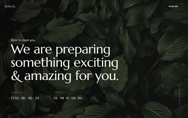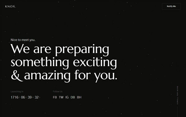 Knox is a clean, modern, and elegant free coming soon website template. Its thin line elements, great use of whitespace, and nice typography give the template a professional, classy design. It is not just aesthetically pleasing it also has the essential functions you need to maintain and engage visitors, and collect new leads while working on your website. Knox comes in three style variants: static, slideshow, and particle background.